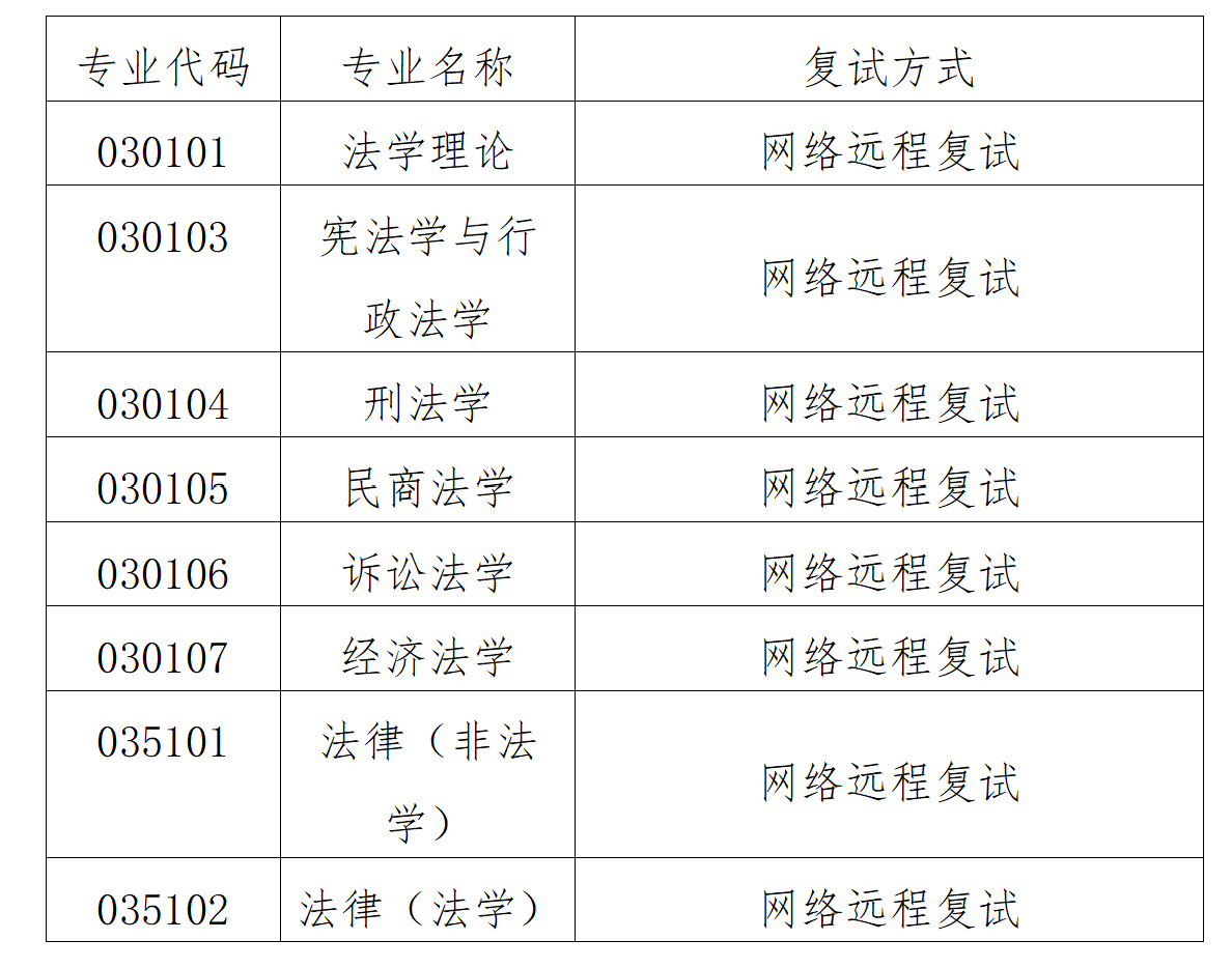 (1)复试内容主要包括①专业笔试。考试科目为法学综合(民法、刑法、法学理论)。②专业面试。主要包括:法学综合(民法、刑法、法学理论)与英语听力及口语考试。③同等学力加试。