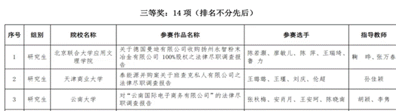 我院分别派出本科组队伍(安惠茵、梁宇婷、冯依文、阮钰涵),指导教师(冯 洁、高茜);研究生组队伍(王璐璐、王瑾、刘庆、伦超),指导教师(孙佳颖)参与涉外商事法律服务赛道。赛程设置个人知识赛和总决赛两个环节,采用线上方式举行,两支队伍均顺利入围决赛,并取得全国三等奖的优异成绩。