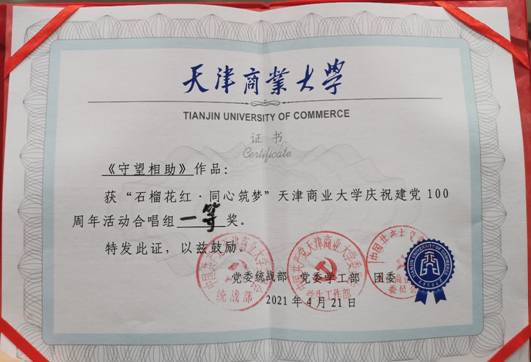 4月21日晚, “石榴花红·同心筑梦”——天津商业大学庆祝建党100周年文艺大赛决赛在科学会堂开赛。我院凭借“守望相助”歌曲荣获合唱组一等奖。